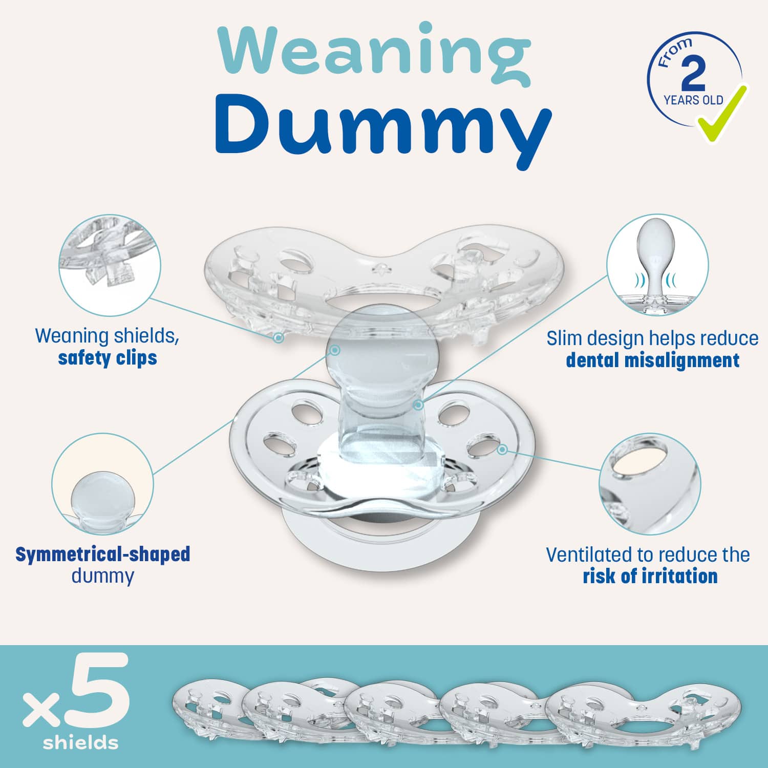 These weaning shields help wean your child off their dummy, little by little, by reducing the sucking habit in 5 stages.